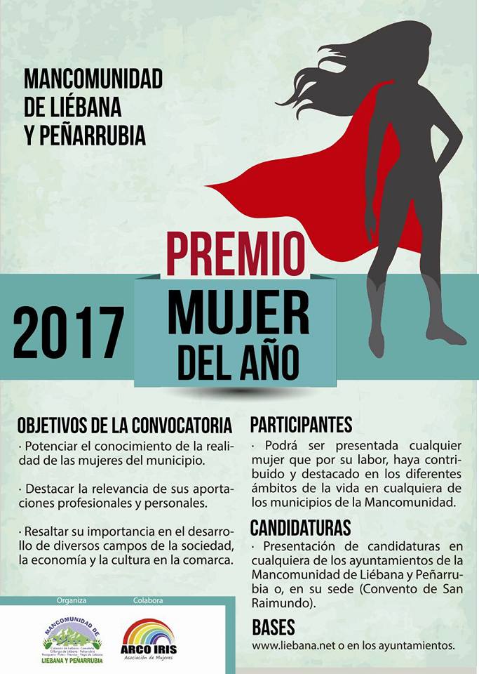 La Mancomunidad de Liébana y Peñarrubia, convoca el III Premio Mujer del Año 2017. Con este premio se pretende dar a conocer la realidad de la mujer en los municipios que integran la Mancomunidad, resaltando la singularidad de aquellas mujeres que han venido y vienen destacando por su trayectoria personal, social, cultural o profesional. Mujeres que han sido capaces de sacar adelante a sus familias, realizando en su vida una doble ocupación, portando responsabilidades familiares y laborales. Mujeres que con su trabajo y su actitud, han hecho de la sociedad de Liébana y Peñarrubia una sociedad próspera en valores, que la diferencian de las demás.