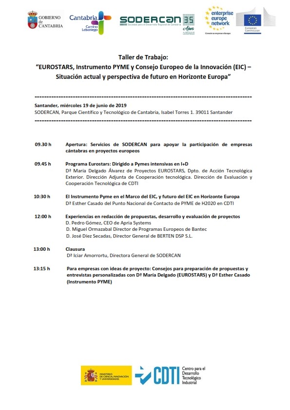 SODERCAN organiza a través de la Enterprise Europe Network (EEN), red de apoyo a las PYMEs con proyección internacional, en colaboración con el Centro para el Desarrollo Tecnológico Industrial (CDTI), el Taller “EUROSTARS, Instrumento PYME y Consejo Europeo de la Innovación (EIC) – Situación actual y perspectiva de futuro en Horizonte Europa”. La jornada tendrá lugar el próximo 17 de junio de 09:30 a 13:30 horas en la sala de la planta cero de la sede de SODERCAN (Parque Científico y Tecnológico de Cantabria, Albert Einstein, 4 – 39.011 Santander). El seminario es gratuito y está dirigido a PYMES cántabras con interés en presentar proyectos a futuras convocatorias del Instrumento PYME y EUROSTARS. Las inscripciones podrán realizarse antes del 17 de Junio de 2019. Más información y formulario de inscripción en el siguiente enlace: Programa “EUROSTARS, Instrumento PYME y Consejo Europeo de la Innovación (EIC)”