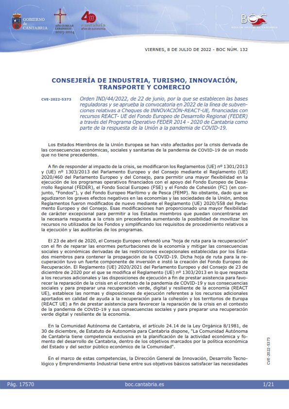 Extracto y Orden IND/44/2022, 22 de junio, por la que se establecen las bases reguladoras y se aprueba la convocatoria en 2022 de la línea de subvenciones relativas a Cheques de Innovación (REACT-UE), financiadas con recursos REACT- UE del Fondo Europeo de Desarrollo Regional (FEDER) a través del Programa Operativo FEDER 2014 – 2020 de Cantabria como parte de la respuesta de la Unión a la pandemia de COVID-19.